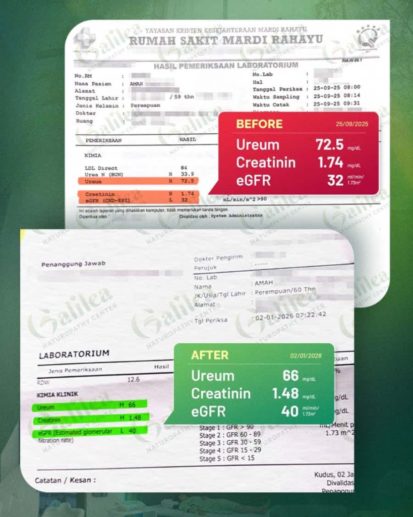 Selama menjalani pemulihan di Galilea, saya selalu didampingi oleh tim dokter dan nutrisionist. Saya juga mendapatkan meal plan, dan tetap bisa berkonsultasi meskipun dari rumah. Perlahan, perubahan mulai terasa. Bengkak di kaki berkurang, dan rasa capek juga semakin membaik. Saat saya cek lab kembali pada tanggal 2 Januari 2026, saya benar-benar senang dengan hasilnya. Kreatinin turun menjadi 1,48, fungsi ginjal (eGFR) naik ke 40, dan ureum turun menjadi 66.