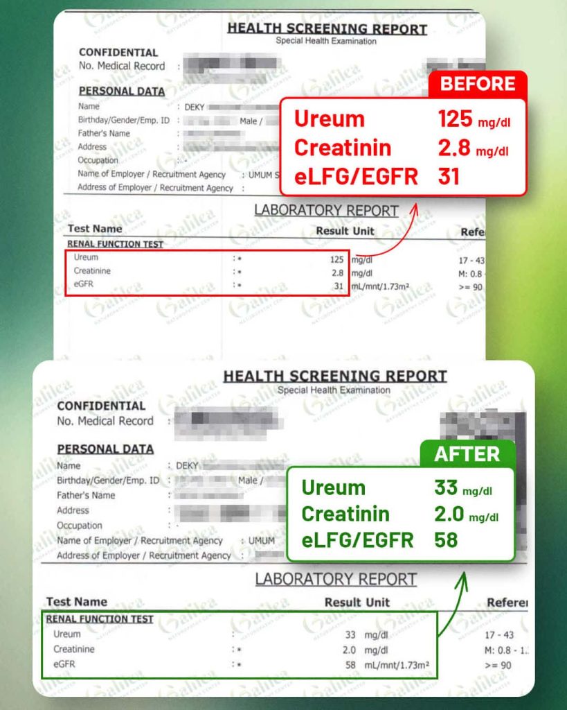 Selama masa pemulihan, dokter memberikan naturopathic medicine serta treatment dengan alat modern untuk membantu perbaikan fungsi ginjal. Saat di rumah pun, saya terus dipandu oleh nutritionist yang menjelaskan dengan detail pola makan yang harus saya jalani. Panduannya jelas dan mudah diikuti. Setelah beberapa bulan menjalani pengobatan di Galilea, hasilnya luar biasa. Ureum saya turun menjadi 33 mg/dl, kreatinin 2.0 mg/dl, dan eGFR meningkat hingga 58. Sekarang saya merasa tubuh jadi lebih fit, seperti sebelum sakit.