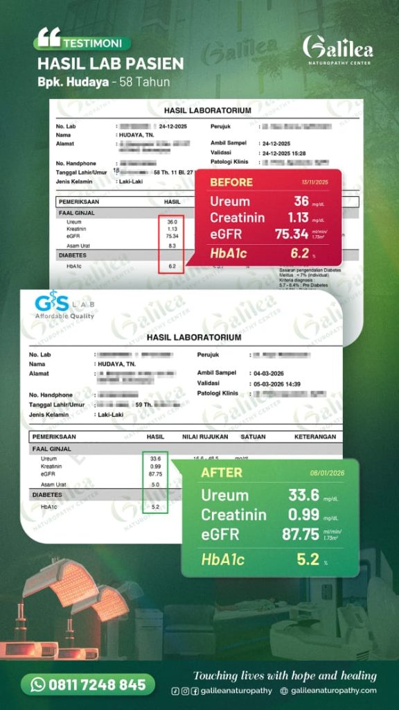 Dari pengobatan ini, saya percaya pengobatan bisa dilakukan dengan cara secara bertahap dan terarah pake modern naturopathy di Galilea, karena saya udah buktiin hasil lab saya juga semua makin bagus, dan jangan sampai kesehatan ginjal dan komplikasi lainnya makin memburuk sampai harus cuci darah. Kuncinya adalah disiplin dan percaya bahwa pasti bisa sehat lagi.