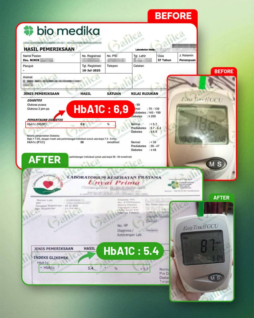 Awalnya saya cuma ngerasa badan cepat capek, gula darah juga naik-turun terus. Pas cek lab, hasilnya bikin makin kepikiran… glukosa puasa naik jadi 165, glukosa 2 jam setelah makan 179, terus HbA1C ikut naik dari 6,7 jadi 6,9 (IFCC 56). Padahal saya sudah minum obat dan jaga makan, tapi kok ya tetap aja nggak stabil.